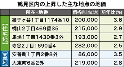 鶴見区内でも5年ぶりに地価の上昇傾向が見られた。住宅地10地点、商業地7地点、工業地2地点で調査。特に、住宅地の平均変動率は1・8%(昨年マイナス0・1%)と市内3位、工業地は3・2%(昨年マイナス0・1%)で県内トップとなるなど、回復傾向がみられた。