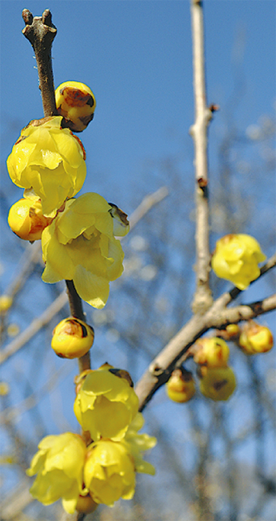 ロウバイは2〜3mほどの落葉低木。同園では毎年2月10日ごろに光沢のある黄色い花を、枝いっぱいに咲かせる。梅に似た香りも、来園者を楽しませる。