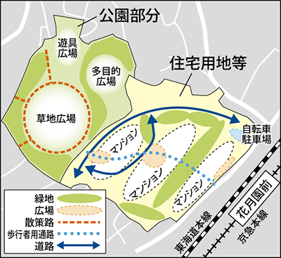 素案によると、花月園競輪場跡地には災害時に避難拠点となる防災公園と、計700世帯が入る3棟のマンションが建てられ、道路や広場などの緑地も整備される予定。