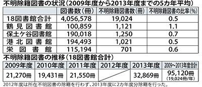 中央図書館を含めた市内18館のうち、監査対象となったのは鶴見・保土ケ谷・港北・栄の4図書館。09年から13年の5年間で不明除籍となった図書の数は9万5120冊、毎年平均で1万9024冊の図書が消えていることになる。