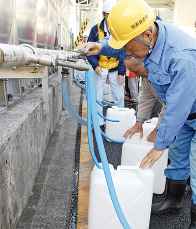 今年は、生麦第一、第二地区自治連合会や、隣接する神奈川区の子安通三丁目自治会などから住民ら約50人が参加。20リットルのポリタンクや袋を使い、給水を体験した参加者からは、「重くて持てない。リヤカーや自転車が必要だ」などと声があがり、災害時の新たな課題として認識していた。