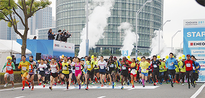 朝8時にはみなとみらい大橋にランナーが集結。林文子市長や黒岩祐治県知事ら同席のもと、横浜出身の女優で大会アンバサダーの剛力彩芽さんが開会を宣言するとスタートを待ち望むランナーからは歓声が上がった。8時30分、号砲を合図に一斉にフルマラソンがスタート。横浜初の42・195Kmに参加者らは汗を流した。