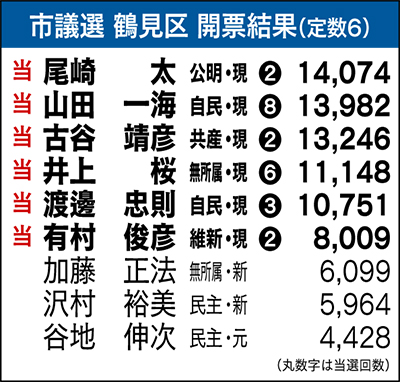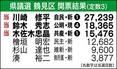 第18回統一地方選挙の横浜市議会議員選挙と神奈川県議会議員選挙の投開票が4月12日に行われた。鶴見区では、6議席を9人で争った市議選で、尾崎太氏(公明)が2期連続のトップ当選。定数3議席に6人が立候補した県議選では、新人の川崎修平氏(自民)が2番手に8千票差以上をつけ圧勝した。
