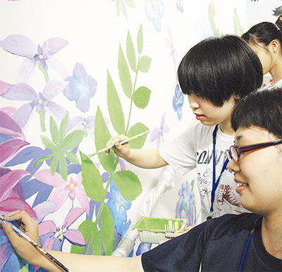壁画の内容は、生徒が提出した原案30点ほどを学内選考で6点に絞り、同院関係者の投票で田中礼美(れいみ)さん(2年)の作品が選ばれた。「夕涼み」をテーマに水や金魚、睡蓮を描いたあざやかな作品に、季節の花々や氷の結晶を加え、壁に合わせてレイアウトを変更。生徒たちは1日16人ほどが交代で参加し、毎日反省会を行いながら制作を進行。7月末から9日間かけ、8月7日に完成させた。