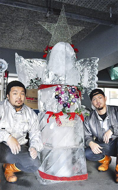 同社は、氷の加工・販売などを手掛けながら、地域活性化のため7年程前からツリーを制作。これまではベテラン従業員が制作を担うことが多かったが、今年は仕事の勉強のためにと若手の安藤寿幸さん、知花正幸さんが担当。羽を付けたツリーが舞い降りる様を表現した。氷の状況を見ながら25日まで展示する予定。(問)同社【電話】045・501・3654