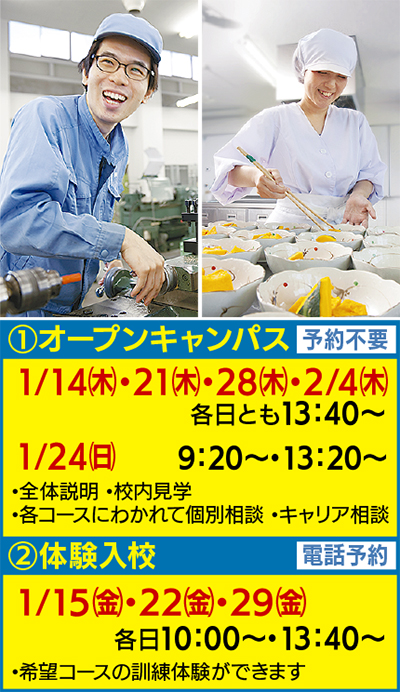 修了生の就職率94%を誇る、県立総合職業技術校。12日から4月入校生を募集。プロの技術を短期で習得する各コース内容は、建築系、工業系、社会サービス系。 1月中に【1】オープンキャンパス【2】体験入校(2時間の授業体験・要予約)あり。