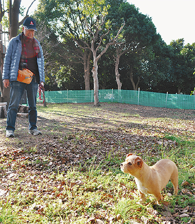 一足先にドッグランを体験した古澤隆さん(朝日町在住)は「公園内には犬が嫌いな人もいるから、こういう場はとてもいい」と、愛犬のはなちゃんがのびのび遊ぶ姿を見て喜んでいた。