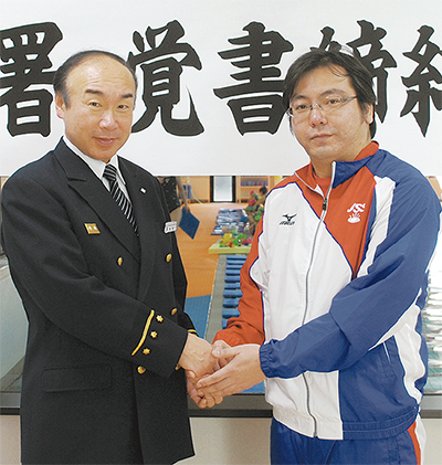 鶴見消防署(齋藤俊彦署長)と(株)JSSスイミングスクール鶴見=鶴見中央3丁目=(保坂卓支配人、本社=大阪市)が1月15日、大規模災害発生時に、同スクールのプール用水300tを消火用水として活用することなどを盛り込んだ覚書を締結した。