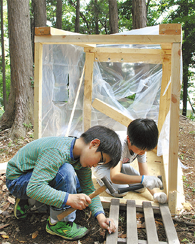 基地づくり当日は、6家族が参加。それぞれ着想したアイデアを形にしていった。木下一期君(小5)と宮城音百君(小3)は、木材を自ら組み立て立方体の基地を製作。完成後中に入ると、「居心地がいい」と満足げだった。守屋幸亮君(小1)は、大好きな猫の顔をイメージし、猫耳やひげをつけた基地を両親と作った。「のぞき窓をつけて工夫した。家族で作るのは楽しい」と笑顔を見せた。