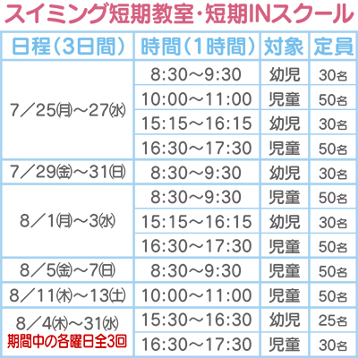 短期教室は、参加費4860円(税込)。水泳(ベビー・キッズ)のほか、ダンス、鉄棒や跳び箱などを学ぶ体育がある。短期からの入会で、水着やバッグ進呈・入会金等無料特典。フィットネス一般会員もWEB予約で入会金等無料(8月15日まで)。8月末まで1日体験5百円。各種申込みは電話予約を。