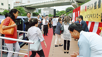 キリンビール(株)横浜工場(勝間田達広工場長)=生麦=で8月23日、工場横の入江川護岸に設置を進めてきた「キリン桟橋」の完成式が行われ、工場見学客を乗せた第一便の歓迎セレモニーがあった。海沿いという立地を生かした海上ルートは「横浜工場でしかできないもの。大きな魅力になる」と同工場は話す。