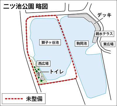 昨夏から一部利用が始まった「二ツ池公園」。2016年度中に未整備の西側の工事を進め、全面開園を目指していたが、延期されることがわかった。西側の工事予定地を所得するための交渉が続いているためだ。横浜市は、公園事業をさらに3年延長する手続きに入っており、19年度までの全面開園を目ざす考えだ。