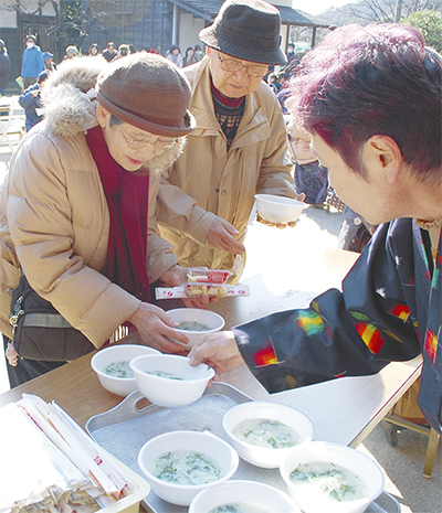 当日は500食を用意。地元農家の野菜を使った手作りの漬物も添えて配布された。毎年訪れているという馬場在住の土肥敬子さんは、「スーパーでも七草は買えるが、ここで採れたものを使うおかゆは一味違う。食べないと1年が始まらない」と話していた。