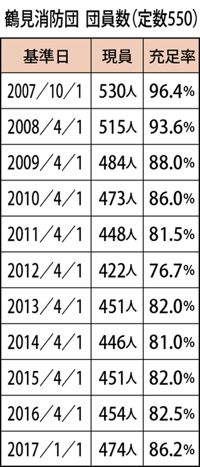 消防団は各自が職業に就きながらも、災害時には消防署とともに活動する消防組織。鶴見は1月1日現在で474人が所属。条例定数(鶴見は550人)における充足率は86・2%で、市内20団中、17番目となっている。