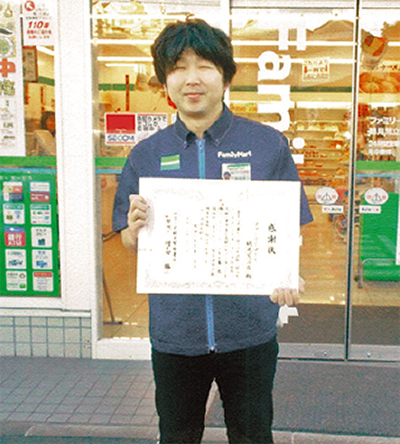架空請求詐欺を阻止したとして、ファミリーマート鶴見荒立店と、同店店長の青木秀人さんへ、このほど鶴見警察署から感謝状が贈られた。