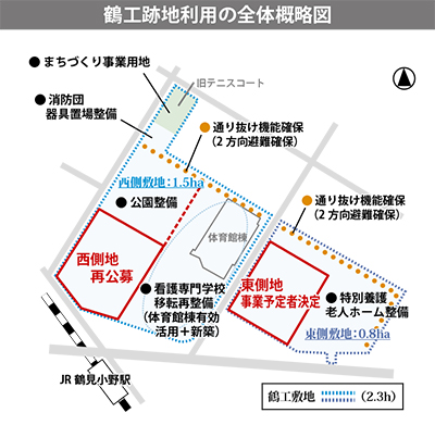 JR鶴見線「鶴見小野駅」そばの跡地は、道路をはさみ東側0・8ヘクタール、西側1・5ヘクタールの土地。現在までに、東側に特別養護老人ホーム(100床)、西側では体育館棟を活用した横浜市医師会看護専門学校などの建設が決まっており、それぞれ整備が進められている。