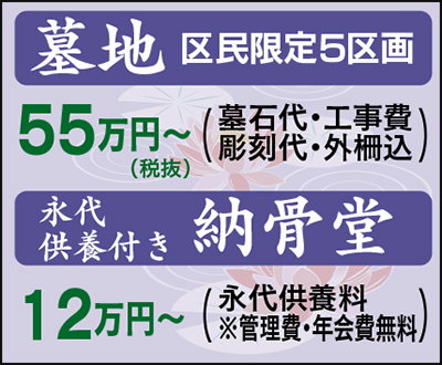 現在、従来墓地では区民特別区画として、限定5区画のみ55万円〜(墓石代、工事費、彫刻代、外柵含む)で販売中(売切れ次第終了)。一方、都市部の墓地不足や、少子化による跡継ぎ問題などで近年人気の納骨堂は、宗旨・宗派問わず永代供養料12万円〜(管理費・年会費無料)。