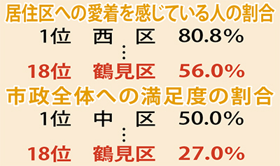 市政全体への満足度についての項目では、回答者全体の38・6%が満足しており、不満とした人は12・4%。そのうち鶴見区民は満足と答えた人は27・0%、不満は15・7%で、市内で最も満足度が低く、不満度が高かった。選択制で市政に対する要望を聞く項目で最も鶴見区民が選んだのは、「地震などの災害対策」と「高齢者福祉」だった。