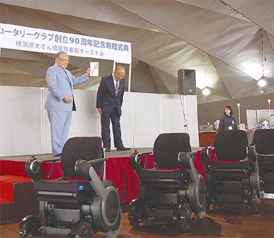 5月16日、パーソナルモビリティ5台を寄贈したのは、今年6月に創立90周年を迎える奉仕活動団体「横濱ロータリークラブ」(横濱RC・加藤和之会長)。同日の寄贈式で、ターミナルの指定管理者JVの代表団体、横浜港振興協会の藤木幸夫会長に目録を手渡した。受け取った藤木会長は、日本の玄関口だった大さん橋を称え、海外の人も多く訪れる同所で「電動車いすの活躍が目に見えるよう」と感謝の意を表した。