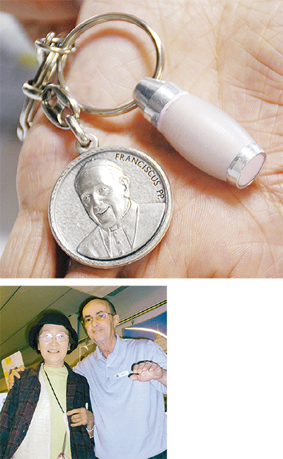 一つは、昨年4月に亡くした夫の遺骨が入った小びん型のもの。そしてもう一つは、今年4月、喜寿祝いにと娘と二人で出かけたイタリア旅行のとき、バチカン宮殿で土産物店の店主からもらったコイン型のものだ。「店主の方も介護の末にお母さんを亡くされていて、元気なうちに連れて行きたかったと。『楽しい旅行を』とくれたんです」