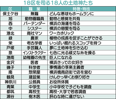物語の見どころは、各区を司り、十人十色の個性と職業、必殺技を持った18人の「土地神」たち。蜂須賀さん自身が市内を自転車で巡って調べ感じた地域の歴史や特性をもとに一人ひとり作られた。