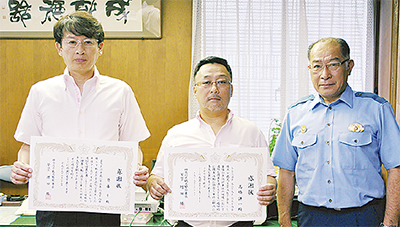 鶴見警察署は7月27日、ひき逃げ事件の犯人逮捕に多大な貢献をしたとして、鶴見区在住で自営業を営む高橋謙一さんと川崎区在住の会社員の齊藤孝さんに感謝状を贈った。
