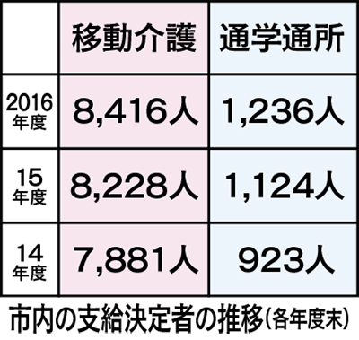 市健康福祉局によると、16年度末の市内支給決定者は計9652人で14年から848人増。一方、現在の同サービス従事者は1万人以下と見られ、担当者は「支援対象者の2倍はいないと(対応が)追いつかないという現場の声もある」と話し、利用者の需要に供給が追い付いていないという。