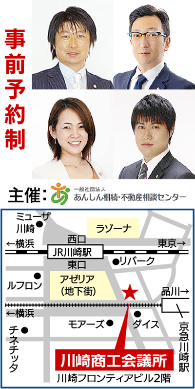 弁護士、司法書士、税理士、宅建士、FPなどの専門家が一堂に集い、相続や不動産に関する悩みに個別で応じる「無料相談会」が4月12日(木)、川崎商工会議所(2階会議室2)で催される。一般社団法人「あんしん相続・不動産相談センター」の主催。今回で5回目。