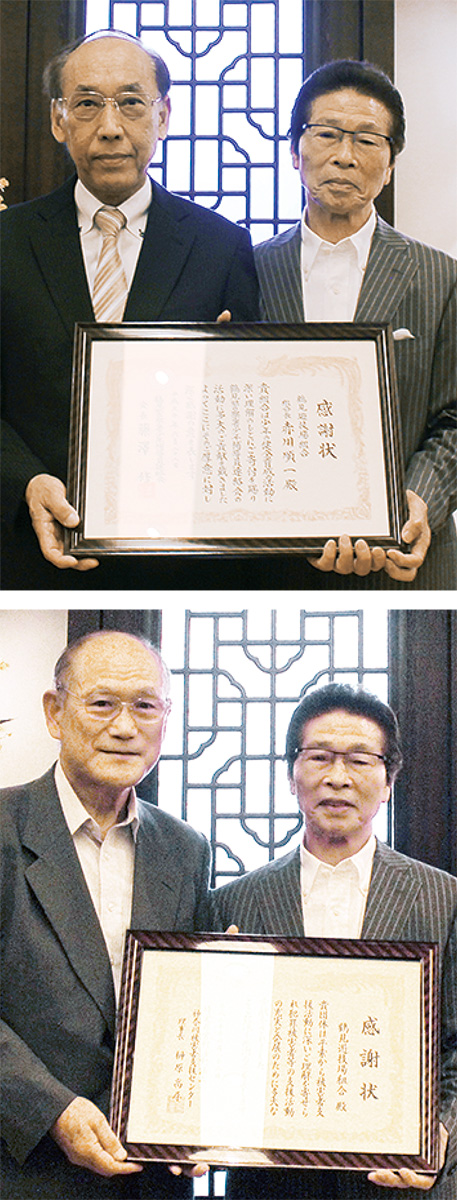 鶴見遊技場組合(赤川順一組合長)は6月22日、萬珍樓本店=中区=でNPO法人神奈川被害者支援センター=神奈川区=と、鶴見警察署少年補導員連絡会から寄付活動に対する感謝状を贈られた。