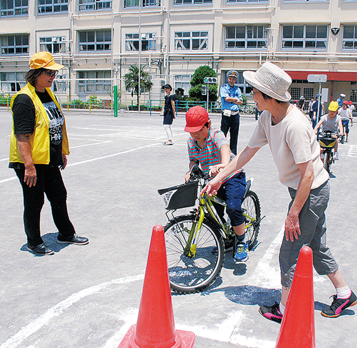 当日は校庭に白線で道路を描き、乗り方を伝授。安全確認の大切さや車の特性などを伝えた。「小さいころから安全意識を高めるのは大事。将来の事故防止につながる」と鶴見署は話した。