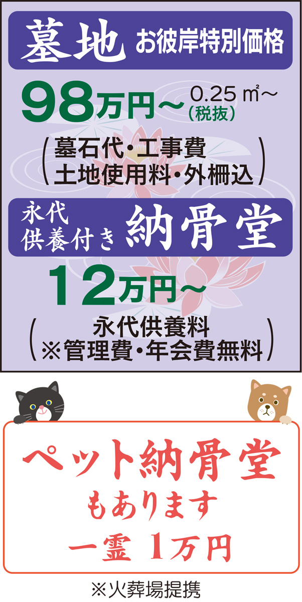 同寺では、生活や家族の形に合わせ、従来の墓地から、屋内霊園と呼ばれる納骨堂、ペット向けのものまで様々な供養の形を用意。特別価格は年に数回。安心して任せられる地元寺院の貴重な販売機会だ。