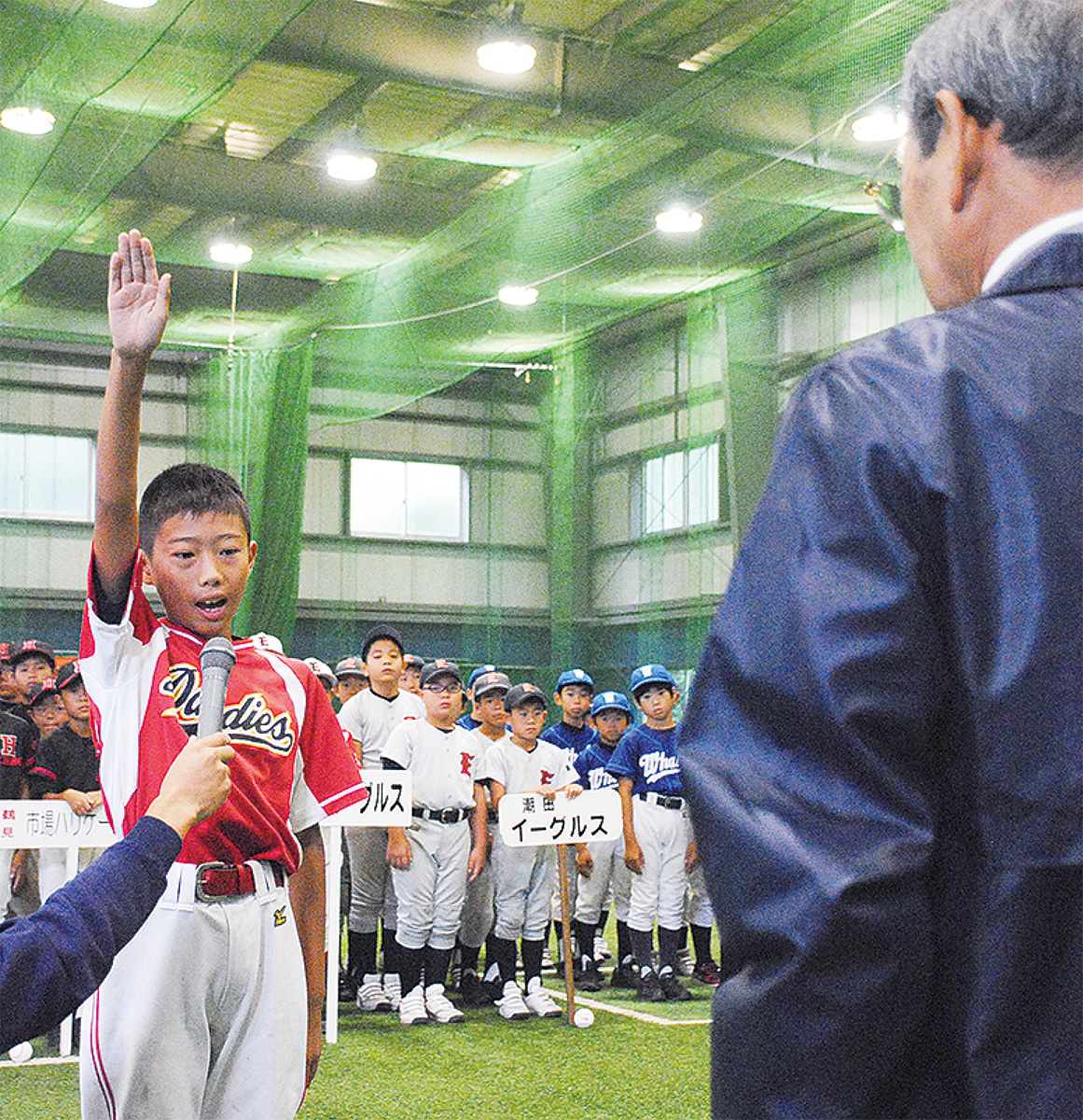 開会式は前日の雨でグラウンドが使用できず、室内練習場で実施された。あいさつに立った大山学長は「たくさん練習した成果を思いきり発揮して、心ひとつにがんばろう」とエール。生麦ダンディーズの岡下拓未主将が正々堂々とした戦いを力強く誓った。