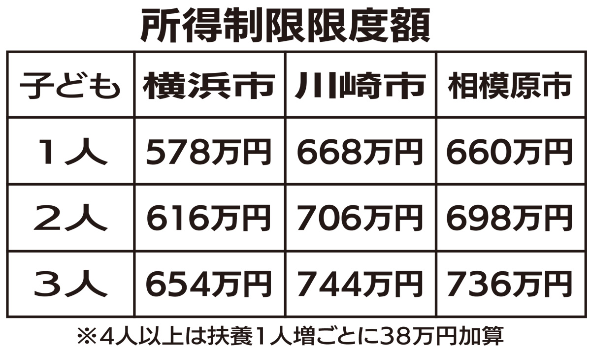 小児医療費助成とは、市内に住所があり健康保険に加入している子どもが病気やけがで医療機関を受診した際に、保険診療の一部負担金を自治体が助成する制度。横浜市では1歳以上の場合、保護者の所得制限がある(表参照)。また限度額以内であっても小学4年生以上は通院1回につき500円の負担金がある。