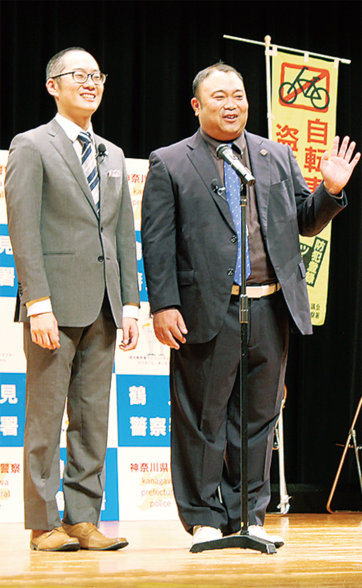 第二部では区内在住の和出仁さんが長谷川崇さんとコンビを組むお笑い芸人のキラーコンテンツが登壇。振り込め詐欺をテーマにしたコントで笑いをとった。