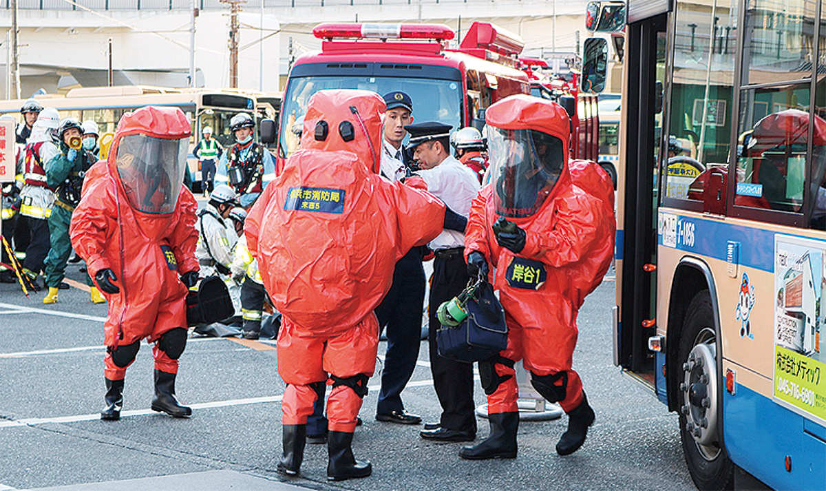 バスの乗客が刃物を使用し、不審物散布により負傷者が多数発生という想定で訓練を実施。警察による犯人逮捕、消防隊の仮救護所設置や不審物処理、YMATの負傷者救護など、同時進行で訓練が行われ、それぞれの動きを確認した。