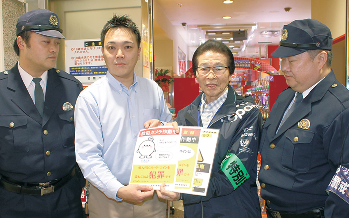 店内外の見回りでは防犯カメラの整備状況なども確認。年齢を指さし確認してもらうためのパネルを渡し、徹底を呼び掛けた。赤川組合長は「置き引きが増えている。楽しく遊んでもらえるように組合一丸で啓発していく」と話した。