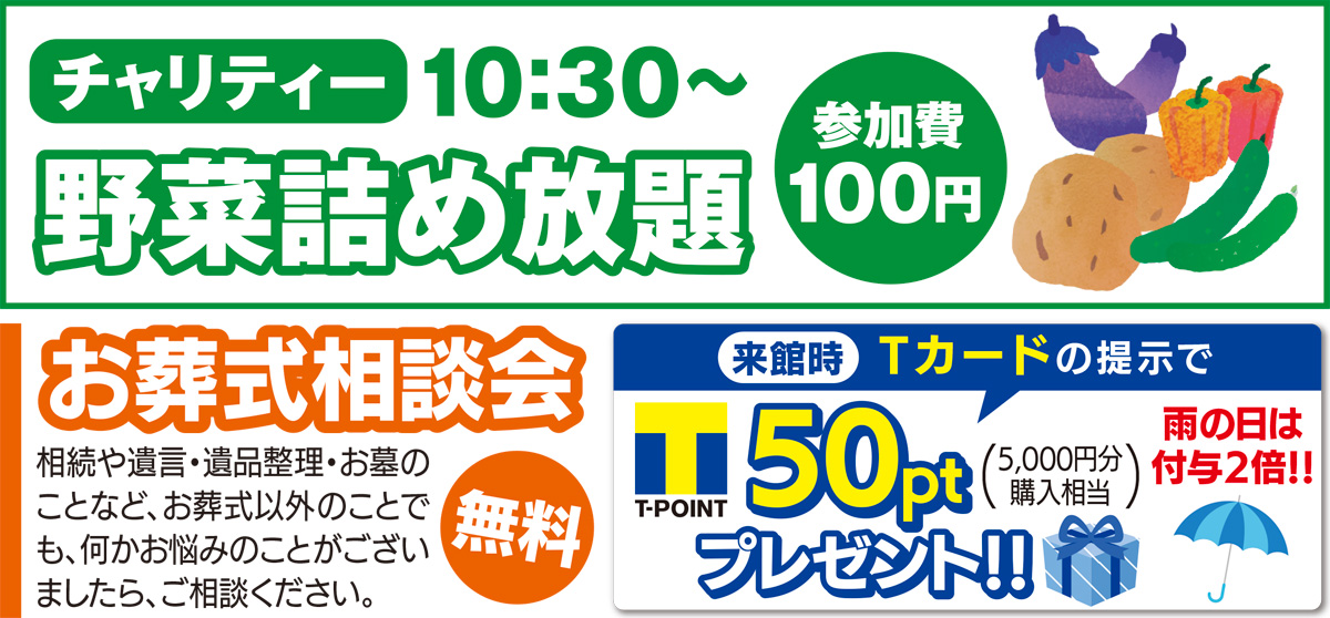 「コンビニエンスストアなどで使える「Tカード」を受付に提示すると、全員にTポイント50ptをプレゼント。雨の日だと2倍付与。「お葬式相談会」も行い、葬儀をはじめ、相続、遺言、遺品整理、お墓のことなどを聞く気軽に聞くことができる。午前10時から午後1時。