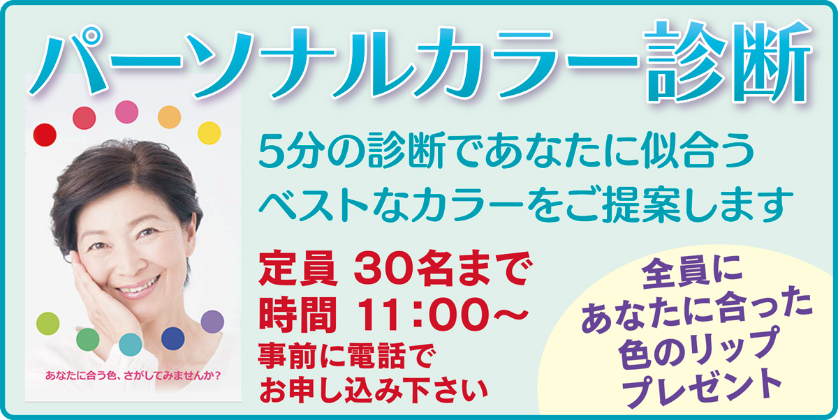 今回は、5分程度の診断であなたに似合うカラーを提案してくれる「パーソナルカラー診断」を午前11時から開始。「明日からすぐに使えるカラーコーディネート術も身に着けられる」と同社。費用は無料。定員は申し込み先着30人。参加者にはリップのプレゼントがもらえる。