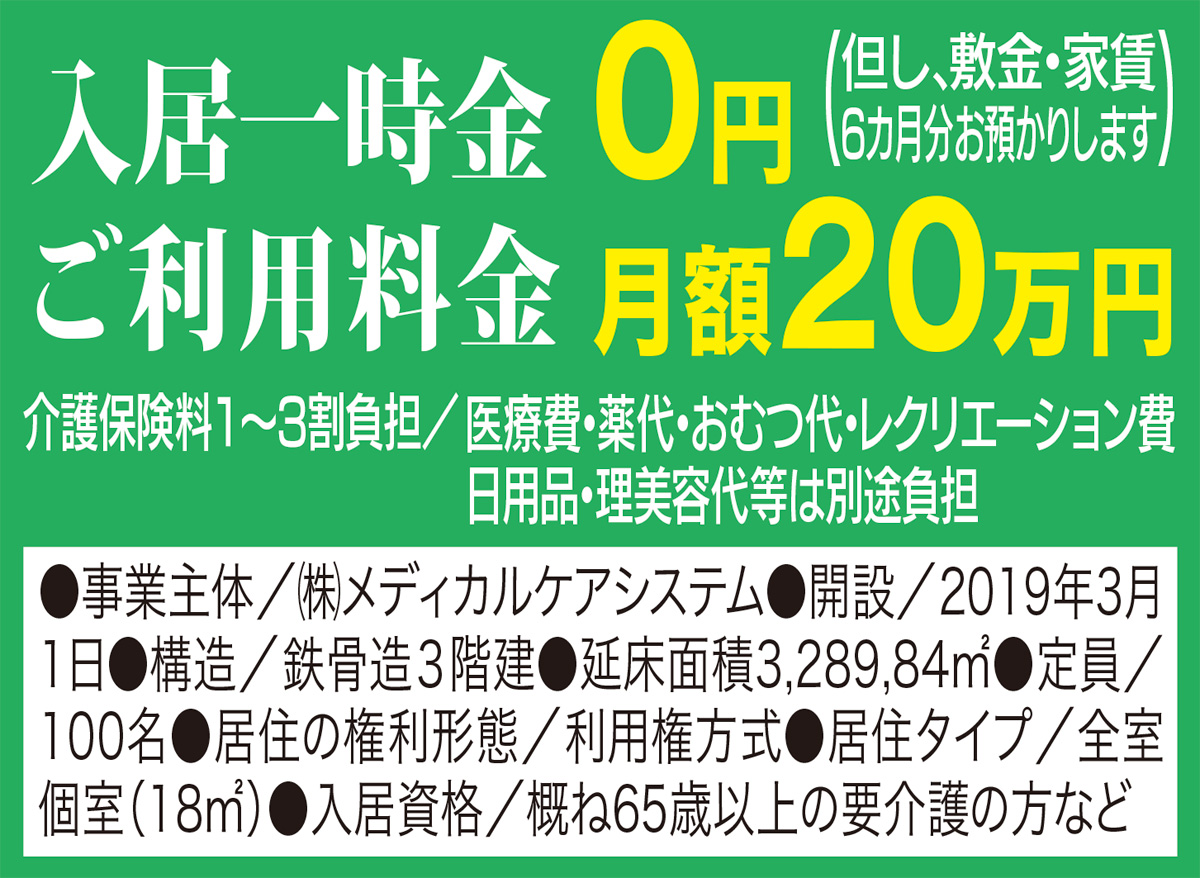 ソフト面では医療面において、近隣にある医療機関と密に連携を取り、医師が定期的に診療するほか日中看護師が複数名常駐し毎日の健康管理を行う。月額利用料は低価格を実現。入居金は、なんと0円で月額も20万円台。資料請求、相談は左記へ。お早めに。