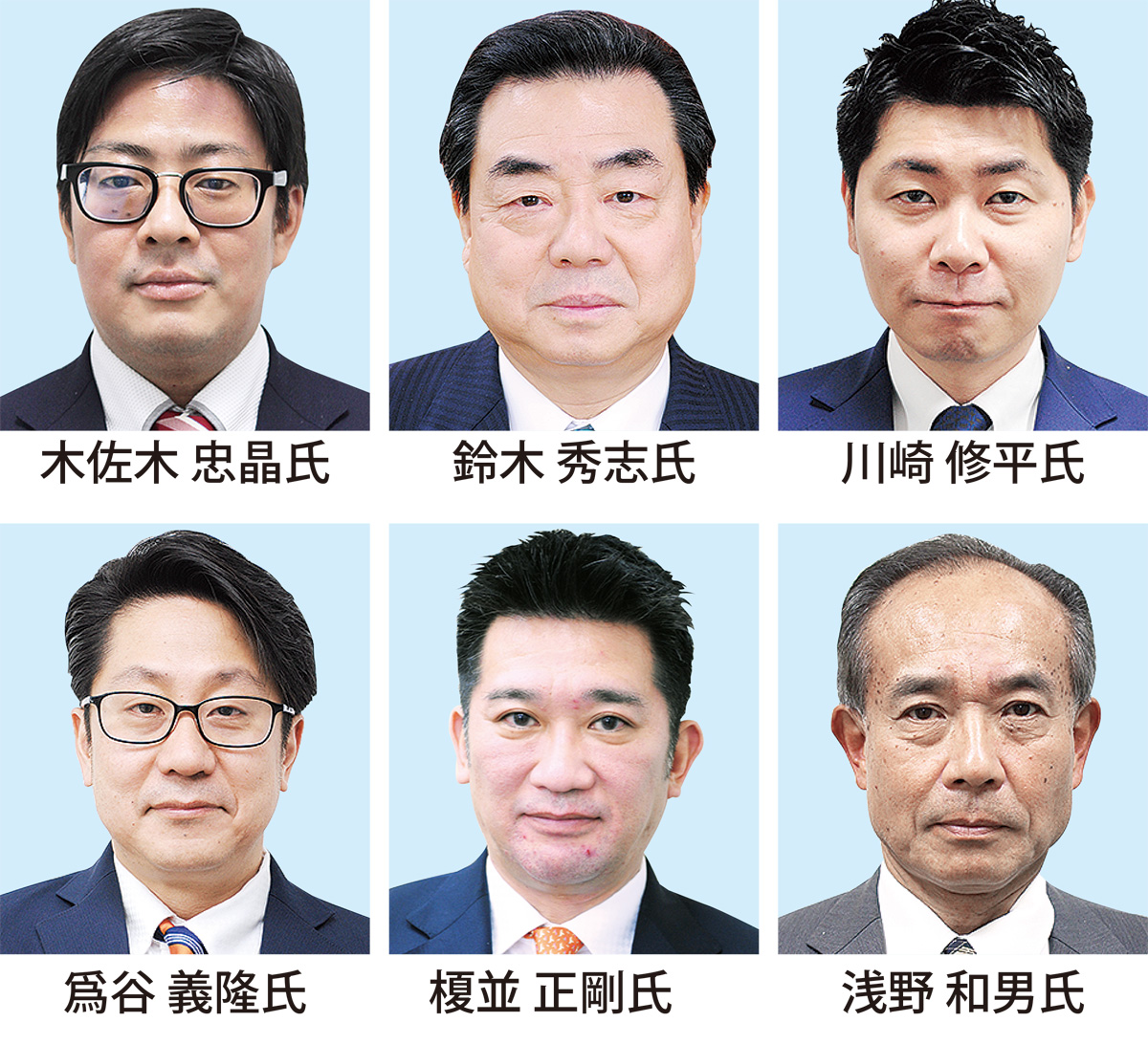 現職は、前回得票順に自民党の川崎修平氏(40・1期)、公明党の鈴木秀志氏(66・4期)、共産党の木佐木忠晶氏(34・1期)の3人が出馬を表明。新人は、希望の党の浅野和男氏(64)、無所属の榎並正剛氏(50)、立憲民主党の爲谷義隆氏(45)が準備を進める。
