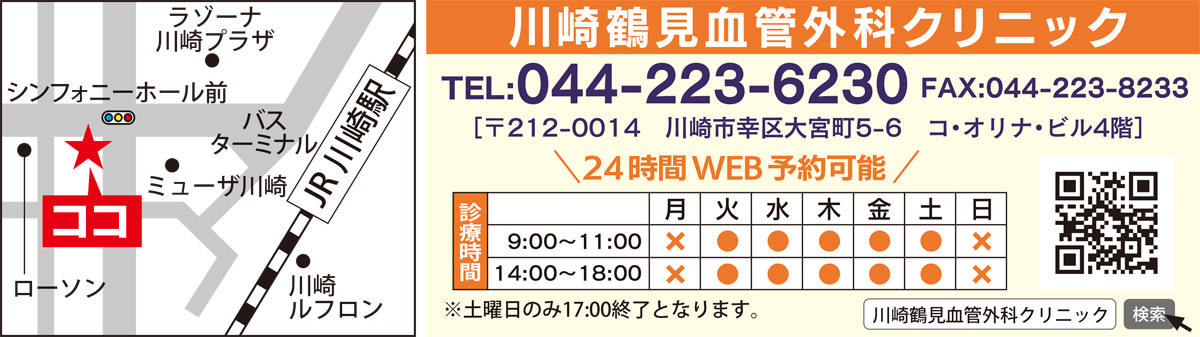 足のボコボコ、むくみやだるさ、高血圧や動脈硬化などに悩む人のための血管病専門の「川崎鶴見血管外科クリニック」が、JR川崎駅西口徒歩3分、ミューザ川崎横に開院した。