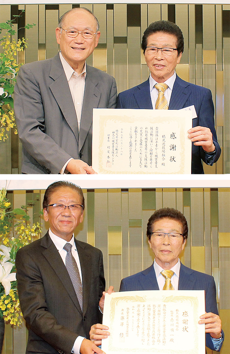 鶴見遊技場組合(赤川順一組合長)は6月28日、ヨコハマグランドインターコンチネンタルホテル=西区=で開いた組合通常総会・懇親会で、NPO法人神奈川被害者センター=神奈川区=と鶴見警察署少年補導員連絡会から、寄付活動に対する感謝状を受け取った。