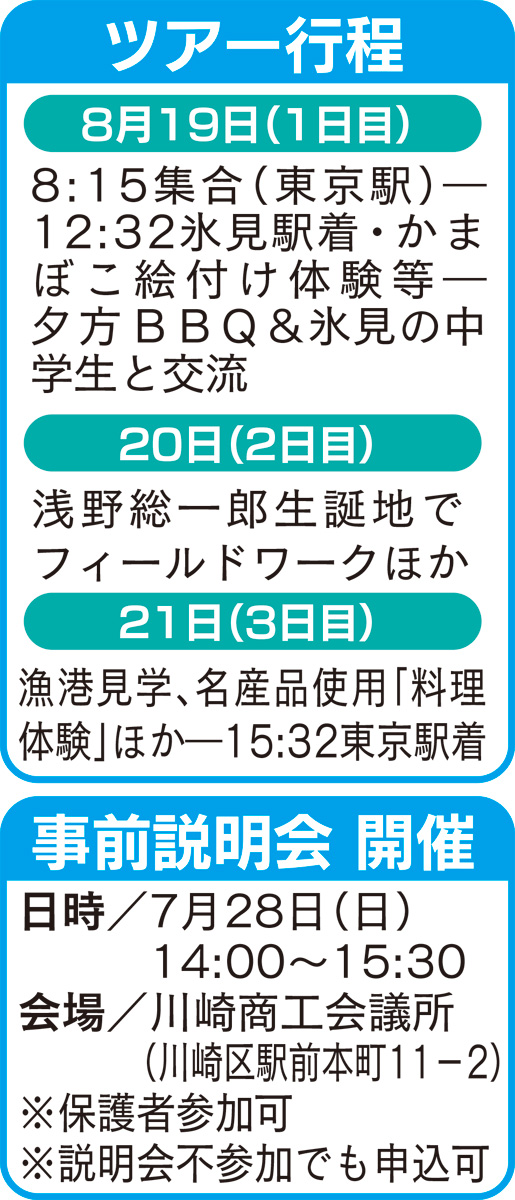 参加費は1万円(税込)。対象は首都圏在住の中学生(保護者の同意、全行程参加が必要)。定員10人(多数の場合抽選)。申し込み・問い合わせは氷見市観光協会【電話】0766・74・5250、【メール】hello@himikan.jp。