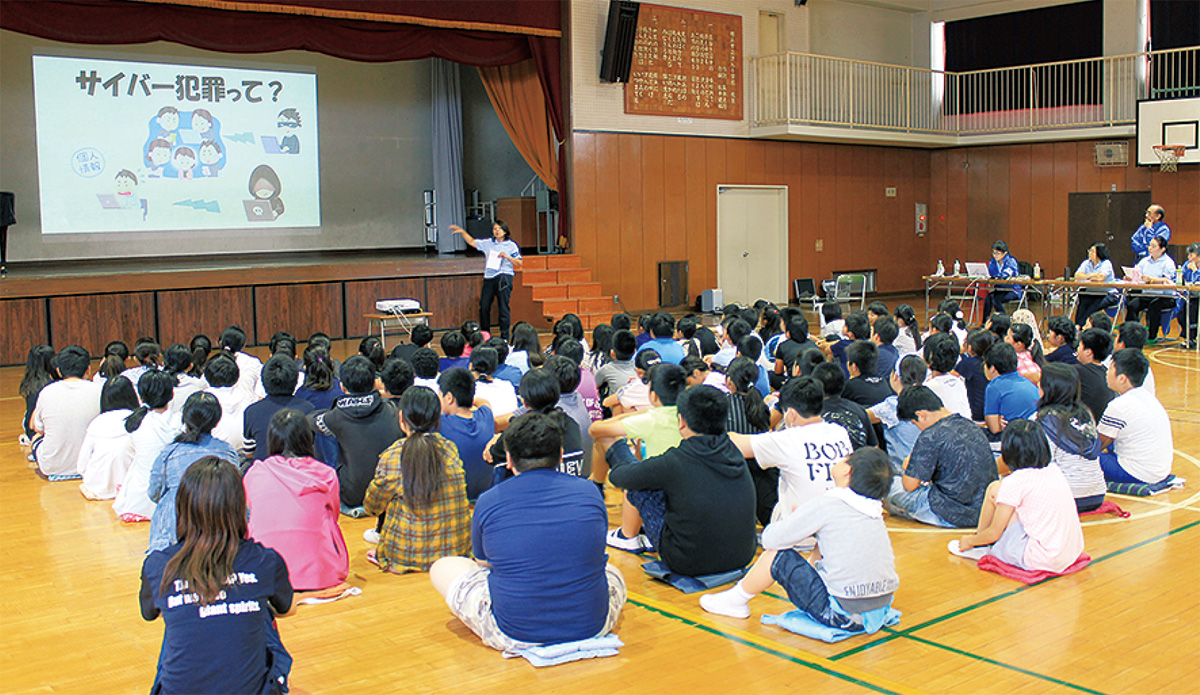 当日は、前半と後半に分かれ、全校生徒199人が受講。オンラインゲームの課金や、ネットでの出会いの危険性、スマートフォンに夢中になることの弊害などを映像を見ながら学んだ。児童らは「ネット依存になると生活できなくなるなんて怖いと思った」などと話し、藤澤会長は「サイバー犯罪は増加傾向にある。活動で少しでも被害が減れば」と話した。