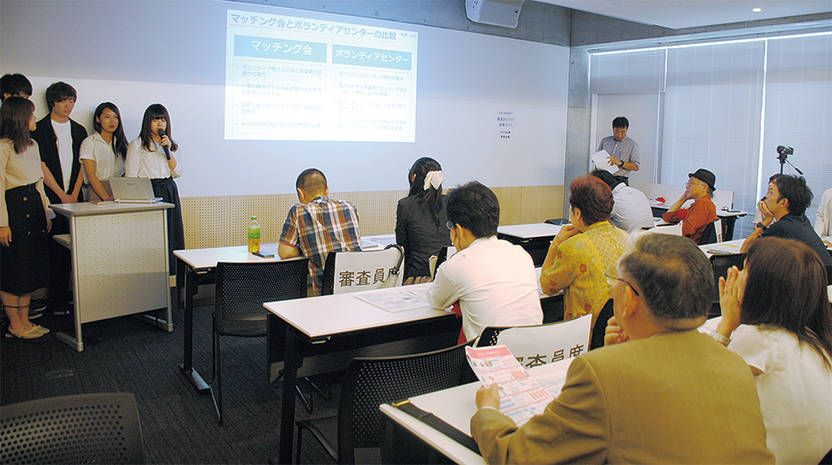 「ボランティア増加」をテーマに、代表プレゼンで最優秀に輝いたチームは、希望者と団体・施設のマッチング会を提案。千葉県船橋市であった事例なども提示しながら、有用性をアピールした。