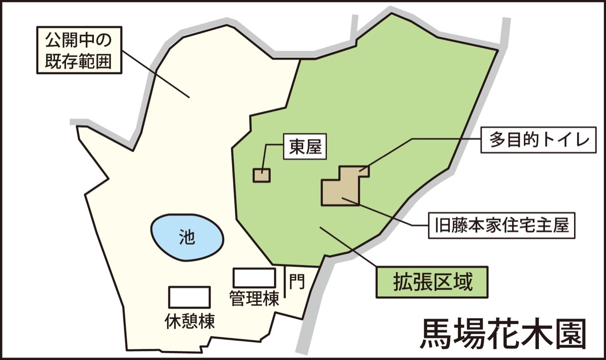 2年ほど前から進められていた馬場花木園の整備が終了し、拡張された新エリアが23日に開園する。新エリアは古民家「旧藤本家住宅及び東屋」や多目的トイレなどがあり、全体の広さは約1・6倍になる。古民家の金田正和館長は「四季を通して楽しめる憩いの場所になるはず」と力を込める。