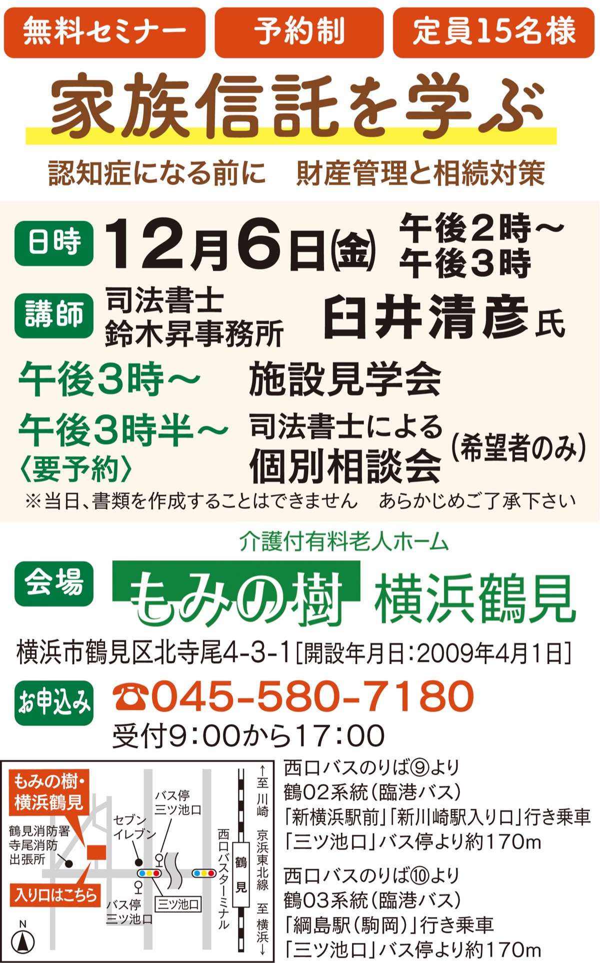 大和ハウスグループの大和ハウスライフサポート(株)が運営する介護付有料老人ホーム「もみの樹・横浜鶴見」で12月6日(金)、午後2時から司法書士を講師に、認知症に備えた財産管理と相続対策をテーマとする無料セミナーを開催する。定員15人。参加無料。要事前予約。