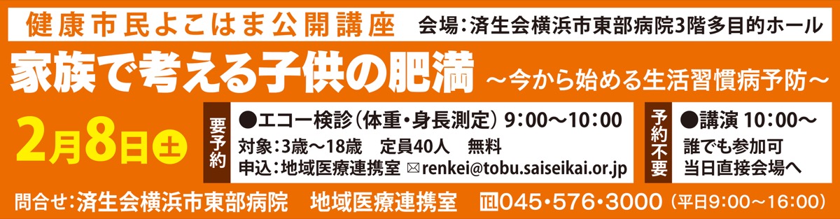 生活習慣病の要因になる「肥満」を子供のころから予防するための無料講座が、2月8日、済生会横浜市東部病院3階多目的ホールで開かれる。