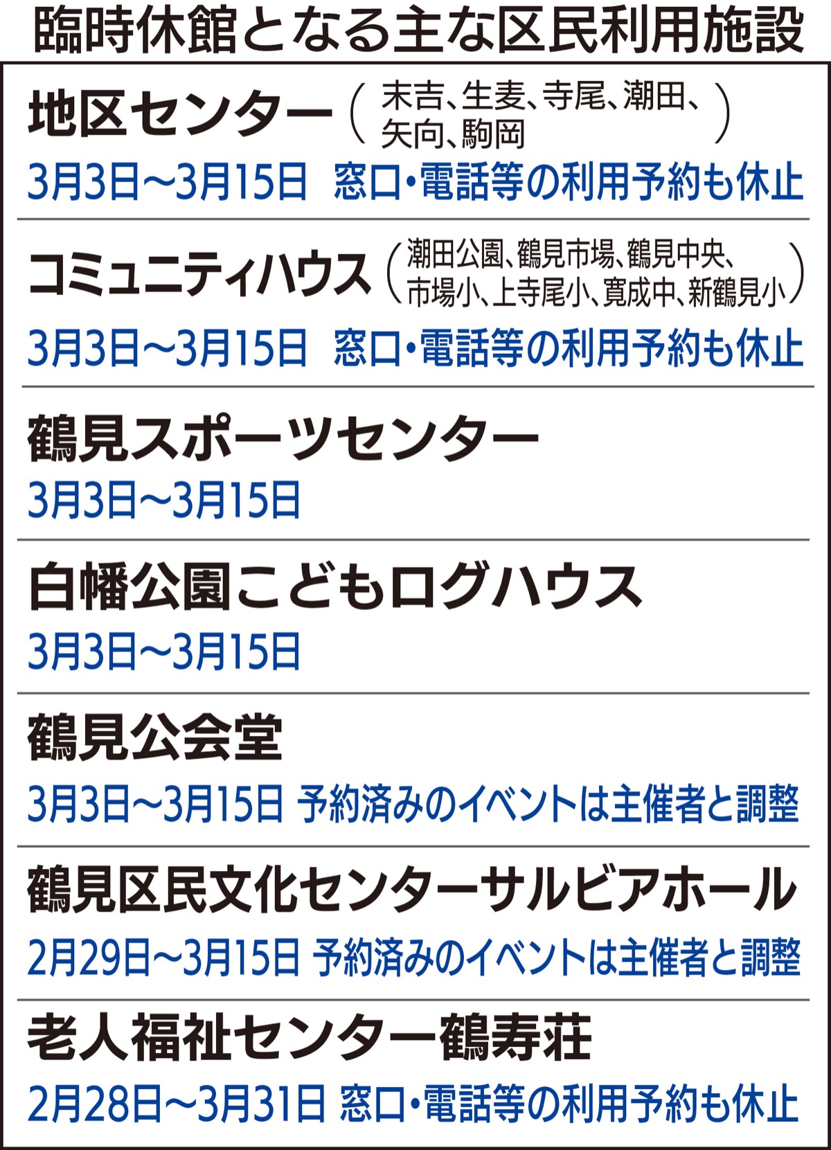 鶴見区内では、地区センター6館、コミュティハウス(学校併設型含む)7施設、鶴見スポーツセンター、白幡公園こどもログハウス、鶴見公会堂が3日から15日、鶴見区民文化センターサルビアホールが2月29日から3月15日、老人福祉センター鶴寿荘が2月28日から3月31日まで臨時休館となる。地区センターとコミュニティハウスは、電話での利用申し込みも休止。サルビアホールと公会堂は、すでに予約のある外部イベントについては個別に調整するとしている。