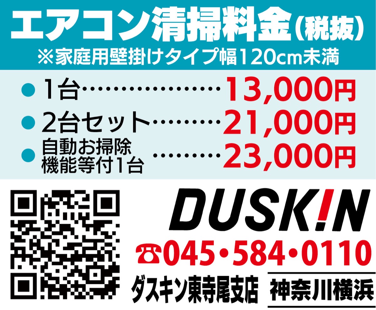 ダスキンのハウスクリーニングは事業開始以来、培った約50年の技術がウリ。使用頻度の多い部屋やペットのいる家庭は1年をめどに掃除を勧める。自動清掃機能はフィルターだけなので、掃除不要は勘違いとか。「すすが飛ぶ」「吹出口に黒カビ」などは、健康を害する恐れもあるため要注意。今なら「タウン見た」で抗菌コート1台分(2100円相当)が半額に。4月末までの申込で、人気のダスキンスポンジを一つ進呈。